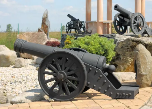Die sehr schwere und große Deko-Kanone ist eine Nachbildung eines Belagerungsgeschützes. Originale Kanonen wurden vom 16. Jahrhundert bis in das 19. Jahrhundert gebaut, bevor es infolge der industriellen Revolution im 19.Jahrhundert zu weitreichenden Neuerungen kam. Diese Deko-Kanone wirkt durch ihre Größe extrem wuchtig und ist ein Hingucker im Garten. Die fahrbare Lafette besteht auch komplett aus Eisenguss.