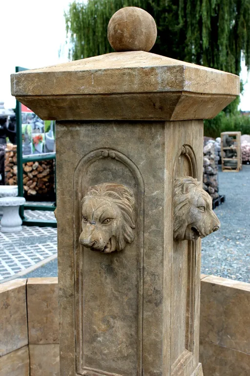 Der Brunnen wird in mehreren Teilen geliefert und umfasst ausschließlich den Brunnenrand (Beckenrand) und die Brunnensäule. In der Brunnensäule und den Löwenköpfen befinden sich die Bohrungen für die Wasserversorgung. Der Boden des Brunnens und die Verrohrung muss selbst hergestellt werden.