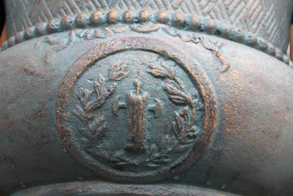 Die Gussamphore Taunus ist eine auffallend prächtige französische Vase oder Pflanzschale mit sitzenden Engeln auf den reich verzierten Griffen. Die Amphore bezaubert durch das elegante Design, das hinsichtlich der prunkvoll gestalteten Engelsfiguren seines gleichen sucht. Der klassisch schlichte Sockel rundet, gegenüber der Gussamphore selbst, das Gesamtbild stimmig ab. Die Amphore ist mit einem antik wirkenden Lack in grünlicher Farbe oberflächenbehandelt.