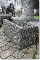 Dieser sehr rustikal gehauene Natursteintrog besteht aus sehr hartem, dunklem Marmor. Der Trog ist witterungsbeständig und damit für den Außenbereich geeignet. Im Boden des Steintroges befindet sich ein Ablaufloch, um überschüssiges Wasser abzuleiten bzw. um Staunässe zu vermeiden.