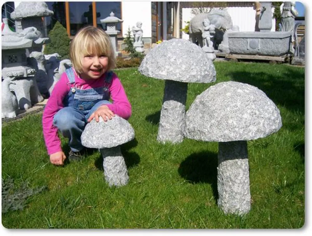 Diese Pilze für die Gartendekoration bestehen aus dem grauen Granit Pearl Flower, einem sehr witterungsbeständigen Naturstein und können das ganze Jahr über draußen stehen bleiben. Die Pilze werden im Set mit jeweils drei unterschiedlichen Höhen, als Dekorationselement für den Garten verkauft.