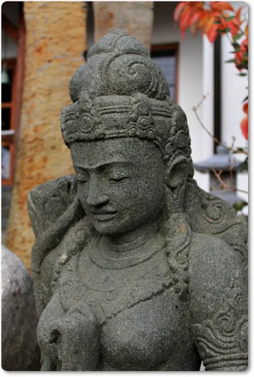 Diese Skulptur aus Basanit lassen wir auf Java anfertigen. Grüne Lava, als Naturstein, kommt auf vielen indonesischen Inseln relativ häufig vor. Der Begriff „Dewi“ kommt aus dem indonesischen und bedeutet Göttin. Die Steinskulptur Dewi Tara ziert viele asiatische Gärten und Tempelanlagen von Tibet bis Java und Bali.