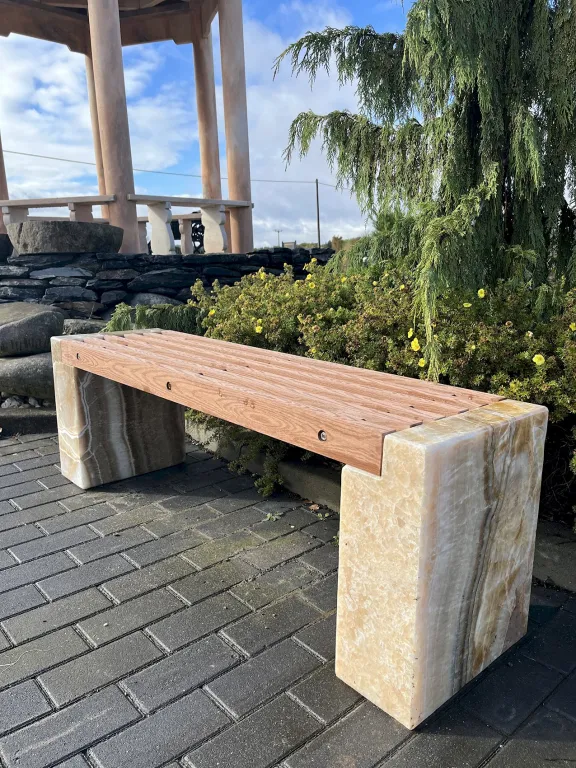 Für anspruchsvolle Garten- und Parkgestaltung ist die Ausführung mit poliertem Onyx die exklusive Wahl. Der Onyx verleiht der Steinbank Prag eine edle, fast skulpturale Wirkung mit faszinierender Farbtiefe und eleganten Lichtreflexen – perfekt für repräsentative Plätze und stilvolle Landschaftsarchitektur.