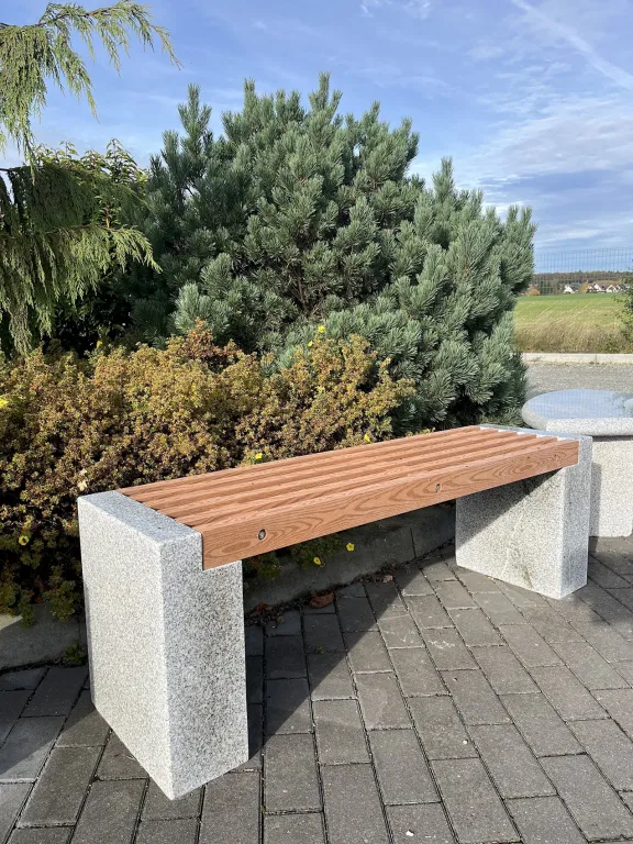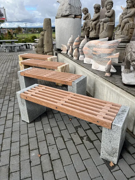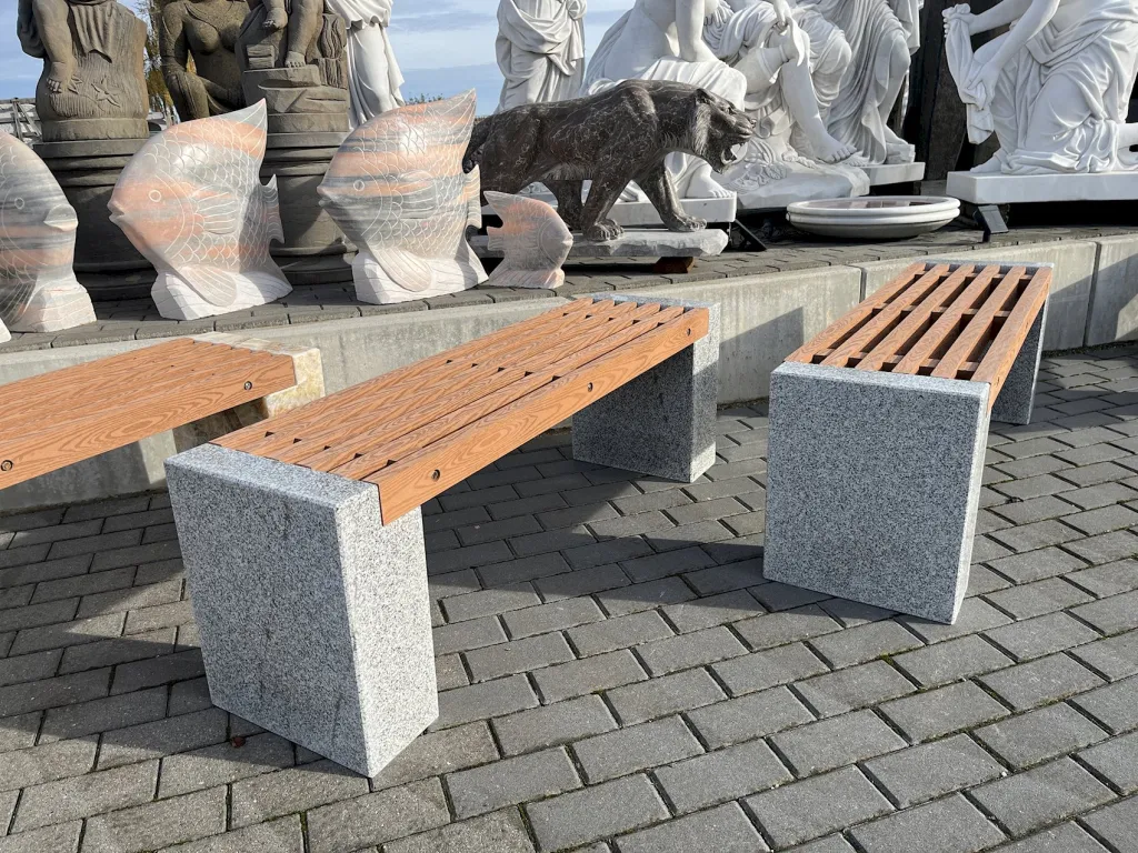 Die Steinbank Prag verbindet natürliche Eleganz mit moderner Nachhaltigkeit und ist ideal für hochwertige Außenbereiche wie Garten, Terrasse oder Parkanlagen. Diese Natursteinbank vereint massive Steinfüße mit einer innovativen Sitzauflage aus recyceltem Kunststoff, die dank realistischer Holzmaserung den warmen Charakter echten Holzes nachbildet – jedoch gegenüber Holz, völlig pflegeleicht und witterungsbeständig bleibt.