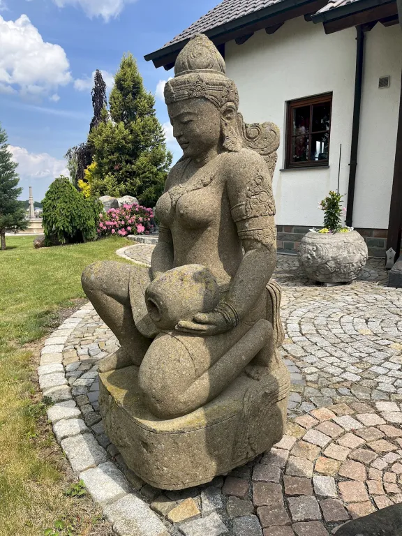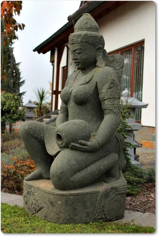Die Steinfigur Siwa Duduk besteht aus Naturstein und kann sowohl für den Außenbereich, als auch für den Innenbereich verwendet werden. Siwa Duduk fügt sich harmonisch in asiatische Gärten, Hotelanlagen oder auch Bäder bzw. Wellnessoasen im asiatischen Stil ein.