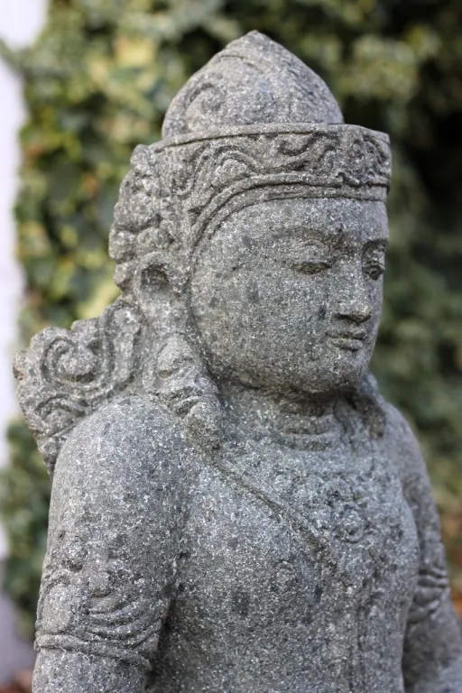 In den Puranas wird Vishnu natürlich erwähnt und ist überall. In den unterschiedlichen Darstellungen werden spezifische Eigenschaften nach dem Charakter ausgewählt und in Form von Gemälden, Skulpturen und Statuen manifestiert. Bei dieser Steinfigur wird Vishnu mit eine Lotusblume dargestellt. Die Lotusblume ist das Symbol der Freiheit und soll die Kraft symbolisieren, die Anlass zum Universum gab.