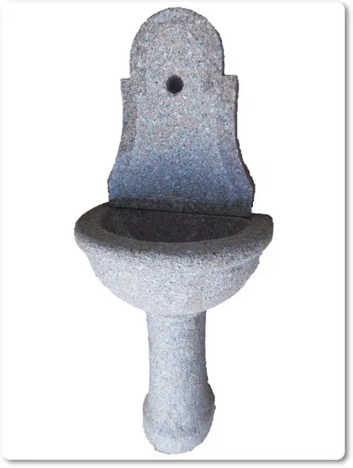 Sehr schöner Wandbrunnen aus rötlichem Granit mit teilweise polierten Oberflächen. Alle Bohrungen für den Wasser- und Abwasseranschluss sind vorhanden. Zum Anschluss an eine Wasserleitung muss die Zulaufleitung in der Wand installiert sein. Eine Bohrung für den Wasserablauf befindet sich im Brunnenbecken und im unteren Teil des Wandbrunnens. Der Brunnen selbst besteht insgesamt aus drei Teilen. Alle Teile sind bei der Montage untereinander, beziehungsweise an der Wand, mit einem handelsüblichen, witterungsbeständigen Bau- oder Steinkleber zusammenzufügen. Passende nostalgische Wasserhähne und Ausläufe aus Messing können im Shop als Zubehör bestellt werden.